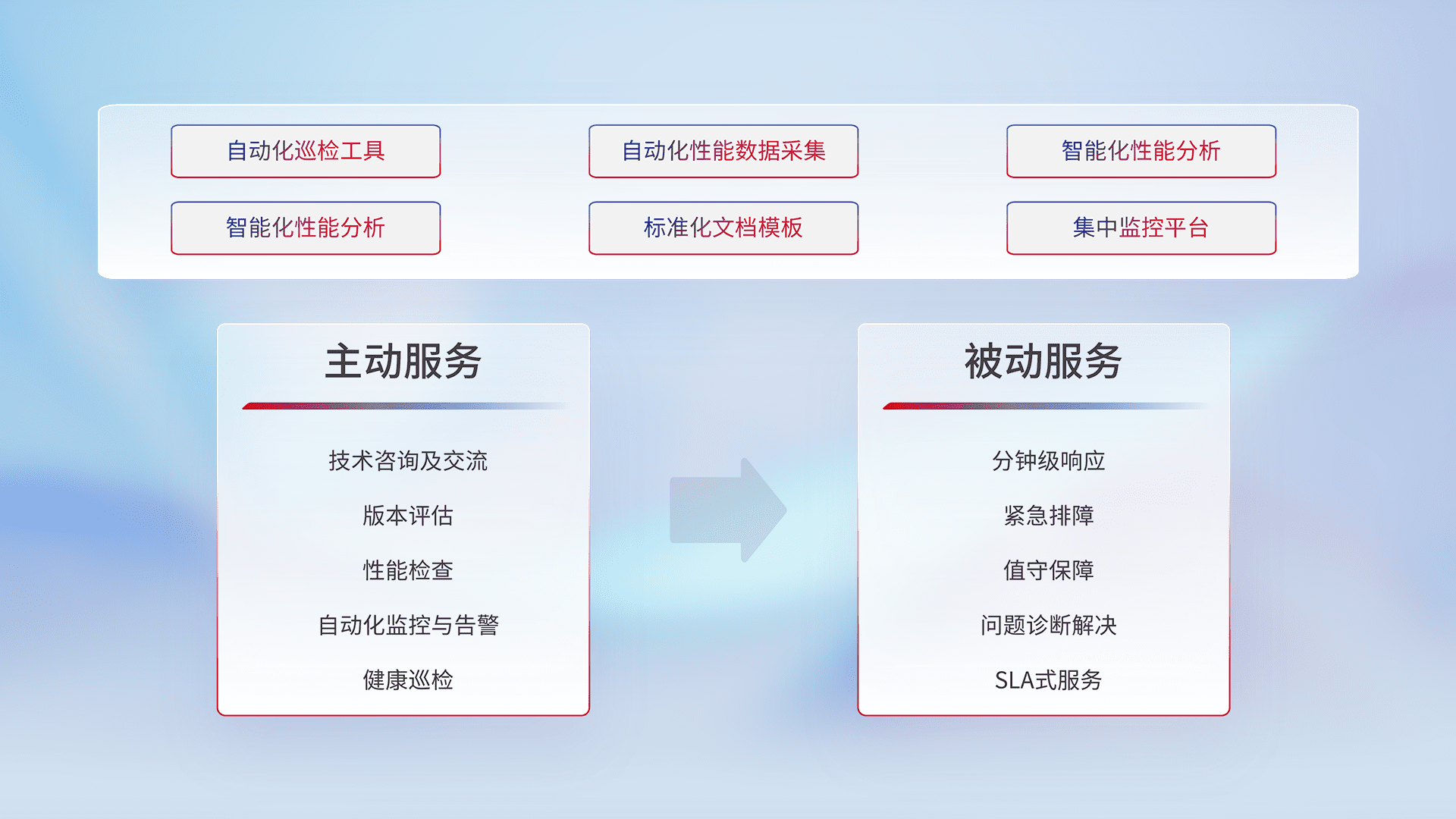 智能化工具和标准化文档,,,,保障服务质量,,,提供主动服务(包含技术咨询、、、、版本评估、、、、性能检查、、自动化监控与告警、、、健康巡检)和被动服务包含(分钟级响应、、紧急排障、、、、值守保障、、、、问题诊断解决、、SLA服务)。。。